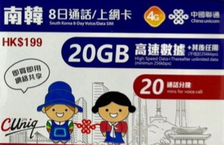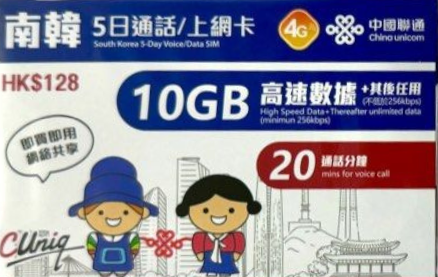 聯通自家推出 韓國 南韓 4G高速上網卡,開漫遊數據即用,送20分鐘通話。